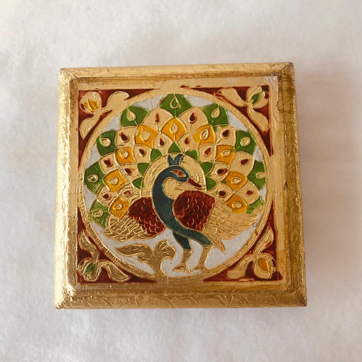 Puja Gold Meenakari peacock design Chowki ,size 15-15cm.